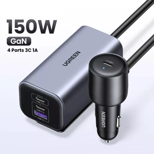 150W GaN Fast Car Charger for iPhone, iPad & USB-C Laptops – 4-Port Power Hub