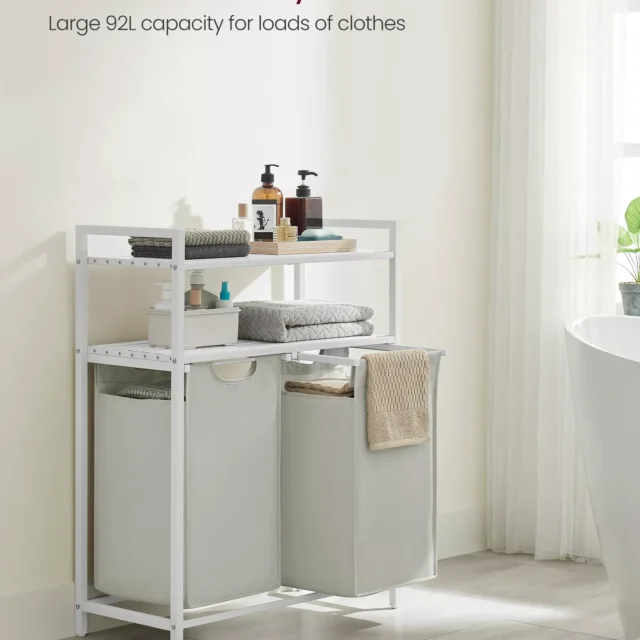 Each of the two pull-out bags holds up to 12.1 gallons, offering a total capacity of 24.2 gallons—ideal for separating lights and darks or clothes from towels. Thoughtfully designed with breathable slatted shelves, this laundry basket keeps your laundry fresh and your essentials accessible.