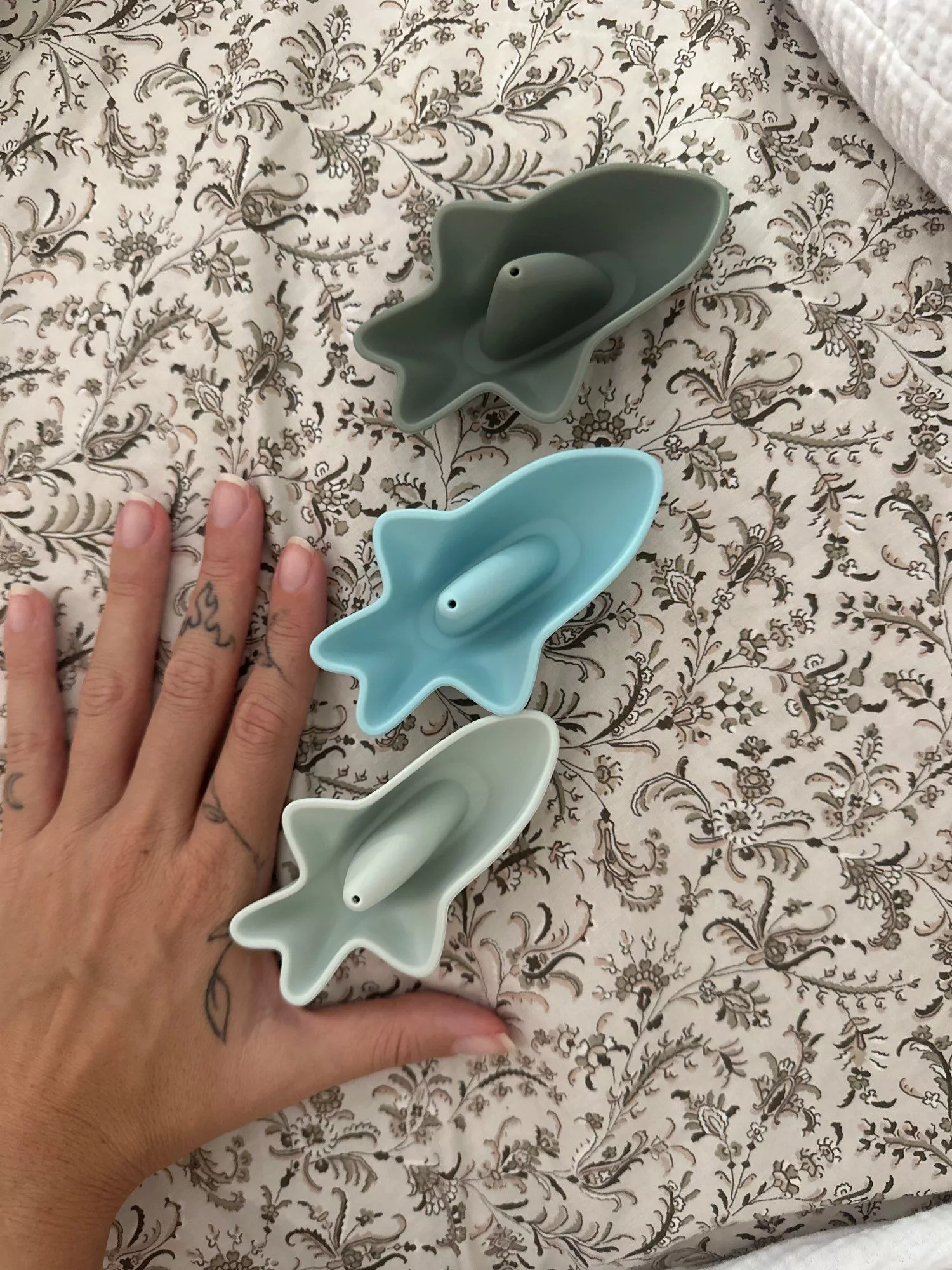 These bath toys have been a lifesaver! The set came with three different pieces, each one more adorable than the next. My little one is absolutely enamored with them. They're made from non-toxic silicone material which gives me peace of mind knowing they are safe for my baby to play with. Plus, their bright and colorful design never fails to catch my child's attention. I've noticed that these toys also help in developing her motor skills and hand-eye coordination as she tries to grasp and manipulate them during bath time. They're lightweight so it's easy for her small hands to hold onto them too! These toys have definitely made our bath routines much more enjoyable.