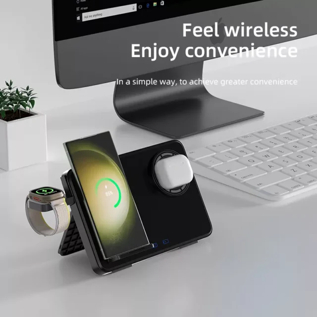 • 4-in-1 Charging Station – Wirelessly charge your phone, watch, earbuds, and more simultaneously.