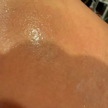 This product looks gorgeous on the skin, with the initial bronze appearance in the bottle transforming into a lovely pink hue upon application. Despite being pale, I found the color to be flattering. Additionally, the subtle baby powder scent, with hints of floral notes, adds to the pleasant experience. Though not overpowering, the fragrance lingers subtly after application.