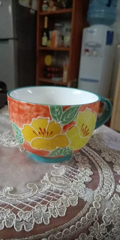 What a beautiful mug! The hand-painted flowers are so detailed, and the colors are vibrant. I love starting my day with a cup of coffee in this beauty.