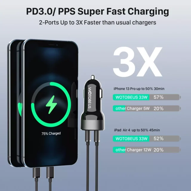 With dual 33W USB-C ports and support for multiple fast charging protocols including PD3.0, PPS, QC3.0, and AFC, you can quickly charge two devices simultaneously—without compromise. It’s ideal for powering up your iPhone 14/13/12/11, Samsung Galaxy S21/S10/S9, iPads, Xiaomi, Huawei, and more. Simply plug into your vehicle’s 12V to 24V outlet, and let this compact powerhouse handle the rest.