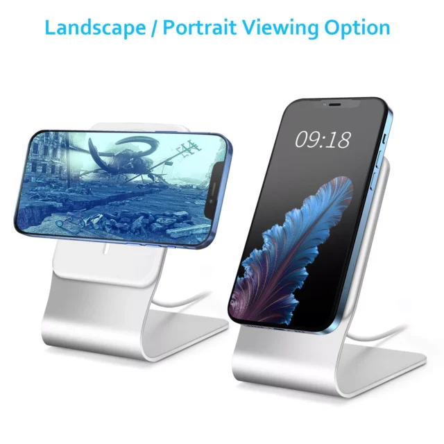 Discover a sleek and functional way to elevate your MagSafe charging setup. This premium aluminum desktop phone stand is thoughtfully designed for MagSafe charger users who value convenience, durability, and aesthetic appeal. Whether you’re working at your desk, watching videos, FaceTiming, or browsing hands-free, this stand ensures your iPhone is always at the perfect angle and securely in place.