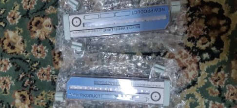 This is pretty cool LED light for bicycle wheels. Each light comes with 3 small batteries. It has motion sensor. It only lights up, when the wheel is moving, when it's stopped - it turns off in few seconds. It has a connector for kids' bikes and fits regular valves (the same as the car one).