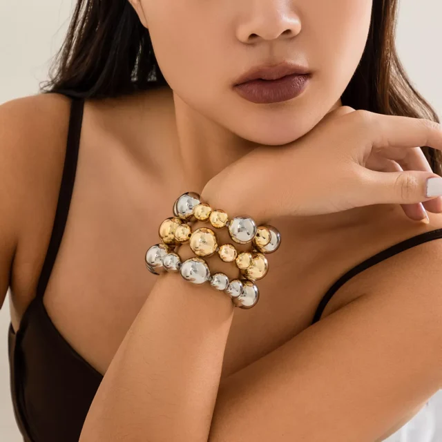 Crafted from lightweight iron alloy, the bracelet combines a geometric bead design with a flexible, stretchable fit—no clasp required. The elastic line ensures it slips on easily and fits most wrists comfortably. Whether worn solo or layered, this piece captures attention with its playful size and retro appeal.