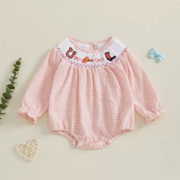 Baby Girl Plaid Romper with Doll Collar and Embroidered Flowers