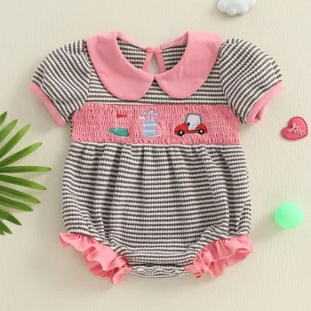 Baby Girl Striped Summer Romper with Golf Embroidery – Short Sleeve Bodysuit