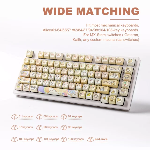 Each keycap is brought to life using a 5-side dye sublimation technique, ensuring vibrant, fade-resistant color from every angle. The set includes fun, hand-painted patterns that are both cute and expressive, while the sculpted MAO profile offers a unique shape that’s ergonomic, smooth, and satisfying to type on. Ideal for daily work, gaming sessions, or simply adding a pop of joy to your desk, these keycaps fit most keyboard layouts and MX-style switches with ease.