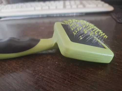 I have a Golden Retriever, and anyone who owns one knows how much they shed. I've tried various brushes, combs, and grooming tools but nothing seemed to do the trick until I stumbled upon this product. Not only does it effectively remove loose hair from my dog's undercoat, but it also untangles any knots without causing him discomfort. The added bonus is that it doubles as a massage brush! My dog absolutely adores the gentle strokes of this tool on his skin — he even falls asleep sometimes while being groomed. It’s easy to clean too which makes maintaining hygiene quite effortless.