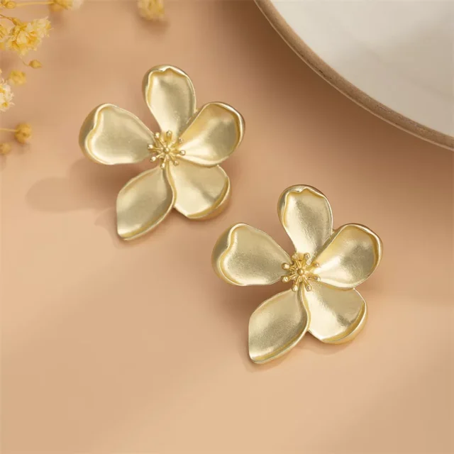 Crafted from durable iron alloy, these earrings showcase a five-petal floral motif that radiates understated sophistication. Available in both classic gold and silver finishes, they feature a secure screw-back design for worry-free wear. Weighing just under 0.4 oz per pair, they offer a solid, luxe feel without compromising comfort. Their bold shape paired with vintage-inspired detailing makes them ideal for the fashion-forward woman who loves blending elegance with personality.