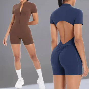 V-Back Scrunch Zipper Sports Jumpsuit for Women – One-Piece Workout Romper