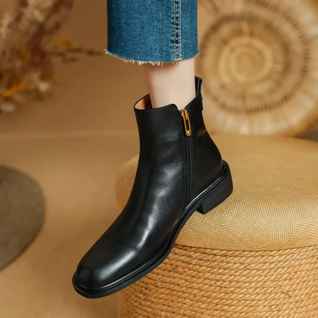 Step into timeless elegance with these genuine leather retro ankle boots, designed for women who value both fashion and comfort. Featuring a classic round toe, practical side zipper, and a sturdy 1.5-inch square heel, these boots add a chic touch to any outfit while providing all-day wearability. The soft short plush insole and genuine leather lining keep your feet cozy, making these boots a perfect choice for the cooler months.