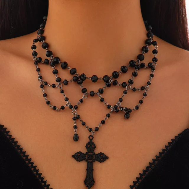 The necklace showcases a large cross pendant as its centerpiece, surrounded by layers of black chains and crystals that reflect light with every movement. At just over 1.3 oz in weight, it offers a luxurious feel without being too heavy on the neck. Crafted from durable iron alloy and high-shine crystals, it’s made to last through countless nights out and costume events.