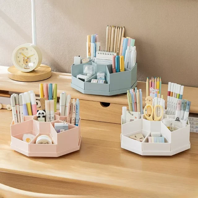 Crafted from durable plastic, this detachable organizer features a 360-degree rotating base that allows you to access your essentials with just a spin. Whether you’re reaching for pens, highlighters, scissors, or small notepads, everything is within arm’s reach. Its high-aesthetic appearance adds a modern, polished touch to any workspace—perfect for the home, office, classroom, or studio.