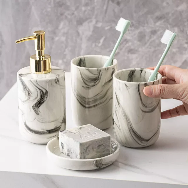 Whether you’re updating your own bathroom or looking for the perfect gift, this ceramic bathroom set is both practical and chic. The marbled pattern brings a high-end spa feel, while the durable ceramic material ensures it will look stunning for years to come. It’s perfect for daily use, guest rooms, or to create that hotel-inspired touch at home.