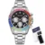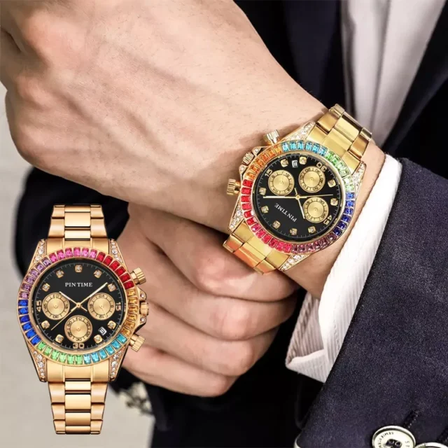 Luxury Men’s Stainless Steel Quartz Watch with Colored Diamonds & Day Date