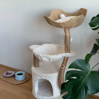 Transform your home into a feline paradise with this beautifully designed modern wood cat tree. Made with natural solid wood and elegant hand-woven rattan, this cat tower doesn’t just entertain your cat — it elevates your interior decor. With multiple levels, cozy spaces, and durable materials, it’s the perfect balance of form and function for the discerning cat owner.