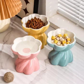 Elevated Ceramic Cat Bowl with Flower Design – Anti-Tip & Neck Protection