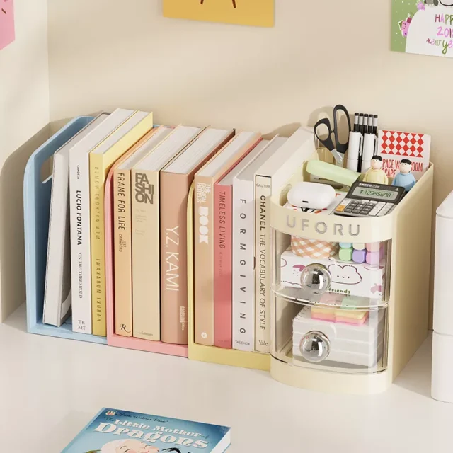 Made with eco-friendly materials, this durable desk organizer features a retractable design that adjusts to your needs. Whether you’re working on a tight dorm desk or a spacious home office table, you can customize it to fit your setup. The thoughtful layout includes adjustable book holders, a convenient drawer for smaller items, and extra compartments to keep your essentials neat and easy to access.