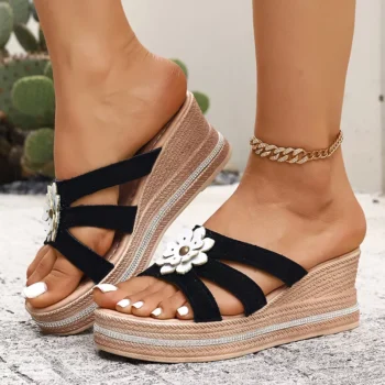 Women’s Summer Wedge Sandals with Floral Decor – Slip-On Platform Comfort
