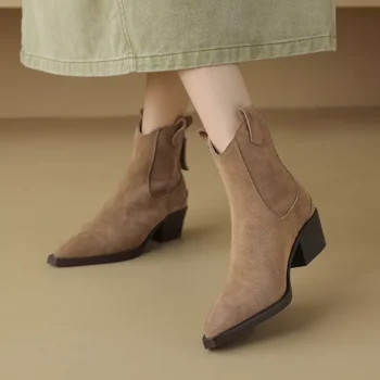 Women’s Suede Ankle Boots with Square Heel and Pointed Toe