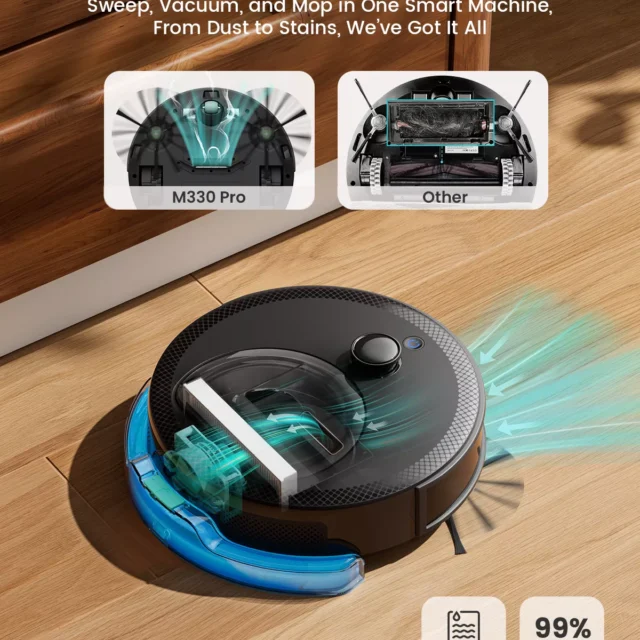 • 3-in-1 Cleaning: Sweeps, vacuums, and mops at the same time for a spotless home in less time.