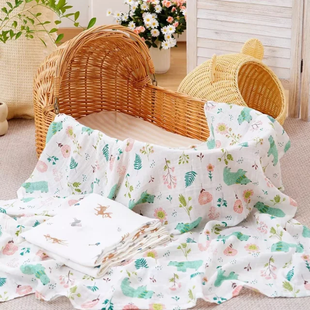 Discover the perfect blend of softness and breathability with these Bamboo Cotton Baby Swaddle Blankets. Crafted from a premium mix of 70% bamboo and 30% cotton, these blankets provide gentle, cozy warmth that soothes your newborn. Measuring 47 by 43 inches, they are spacious enough for swaddling, wrapping, or laying out as a play mat. Their muslin weave ensures they are lightweight yet durable, ideal for year-round use.