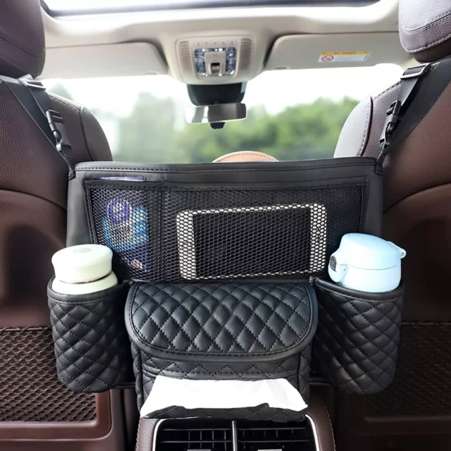 This car organizer is not just stylish but incredibly functional. It features multiple compartments for your handbag, phone, tissues, water bottles, and more. The universal design makes it easy to install without tools, fitting most cars with a center armrest. Its sturdy construction ensures that your items stay secure, even during sudden stops or turns.