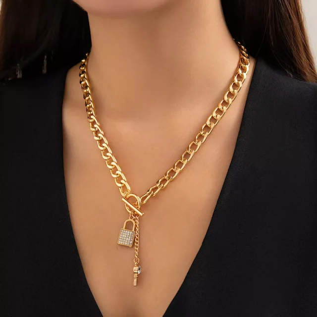 This choker is crafted from lightweight yet durable aluminum metal, making it comfortable to wear all day without sacrificing style. It features a chunky Cuban link chain design with an OT buckle closure for easy wear and removal. The standout elements? A grunge-inspired lock and key pendant duo, finished in a striking blend of gold and silver tones for a dramatic, layered effect. Measuring approximately 16 inches in length, this necklace sits perfectly around the neck to highlight your collarbones and elevate your look with edge and elegance.