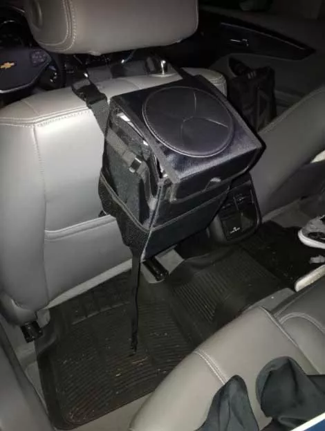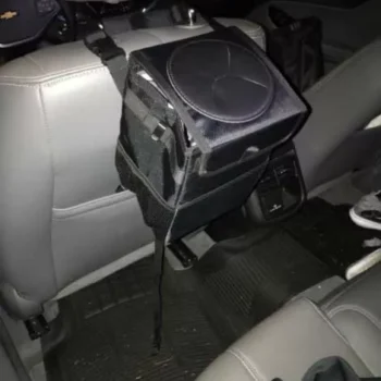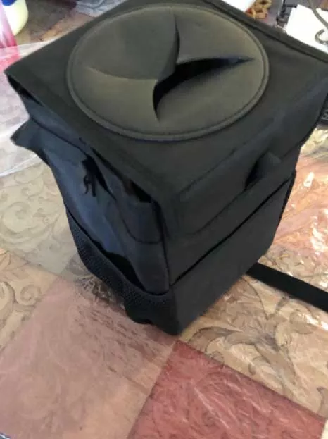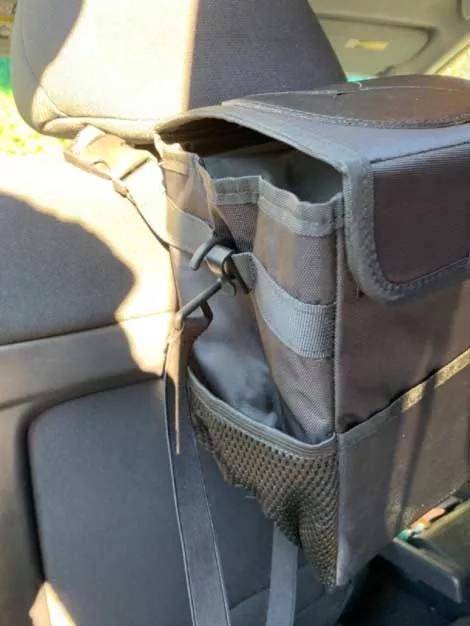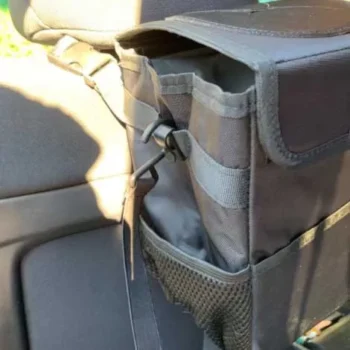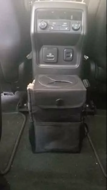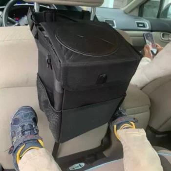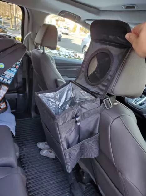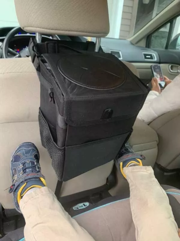This trashcan works well in our SUV. With three kids and a busy schedule we often eat snacks or food in the car. This is the third trashcan I’ve now bought for a vehicle, and this one they got it right. The size is good and holds quite a bit. The thing I like the most is the top you don’t actually have to undo it or do anything to access the trash can you just push it in the top. My kids broke the last one by stepping on it too many times, and this one actually is elevated off the ground which makes less of a tripping hazard. You can also put a trash liner it so you can just take out the whole bag of trash out quickly and easily. It also had like a bungee cord on it if you didn’t want to use the strap if you wanted to utilize it somewhere else. I put it around my center console so it could be utilized in the backseat.