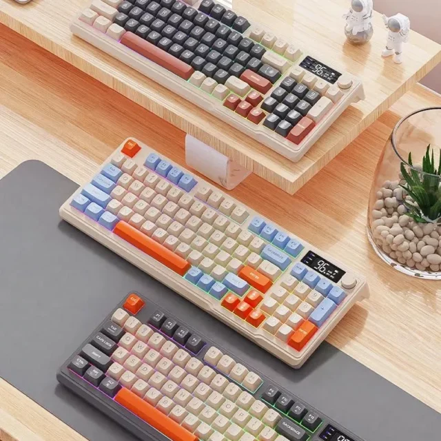 The wireless keyboard features a built-in smart screen, allowing you to monitor connection status and battery level at a glance. Its 96-key minimalist layout saves space without sacrificing essential functions, and the dual-mode connectivity (Bluetooth and 2.4GHz) ensures smooth switching between up to three devices — perfect for tablets, laptops, and desktops alike. The soft PBT ball-keycaps provide a satisfying tactile feel, while the dazzling backlit keys add visual flair to any environment.