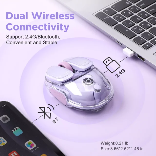 Bring charm and performance to your workspace with this compact wireless RGB mouse designed for smooth, quiet control. Featuring a translucent finish and a soft purple glow, this sleek mini mouse is built for portability and elegance—perfect for on-the-go professionals, students, gamers, or anyone who appreciates minimal design and maximum functionality.