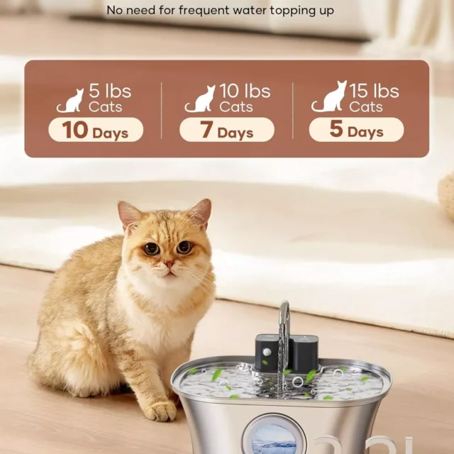 Keep your furry friend hydrated and healthy with this sleek, smart, and wireless cat water fountain. Designed for both cats and small dogs, this 3.2L (108oz) stainless steel water dispenser offers a consistent supply of clean, running water—no cords, no limits. Whether you’re placing it on the floor, a countertop, or by a sunny window, this battery-operated fountain fits seamlessly into any space while keeping your pet’s safety in mind.