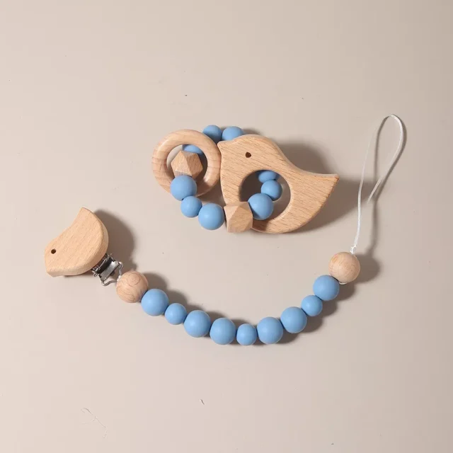 Wooden Bird Pacifier Clip & Silicone Bead Teething Chain Set – 11″ Baby Soother